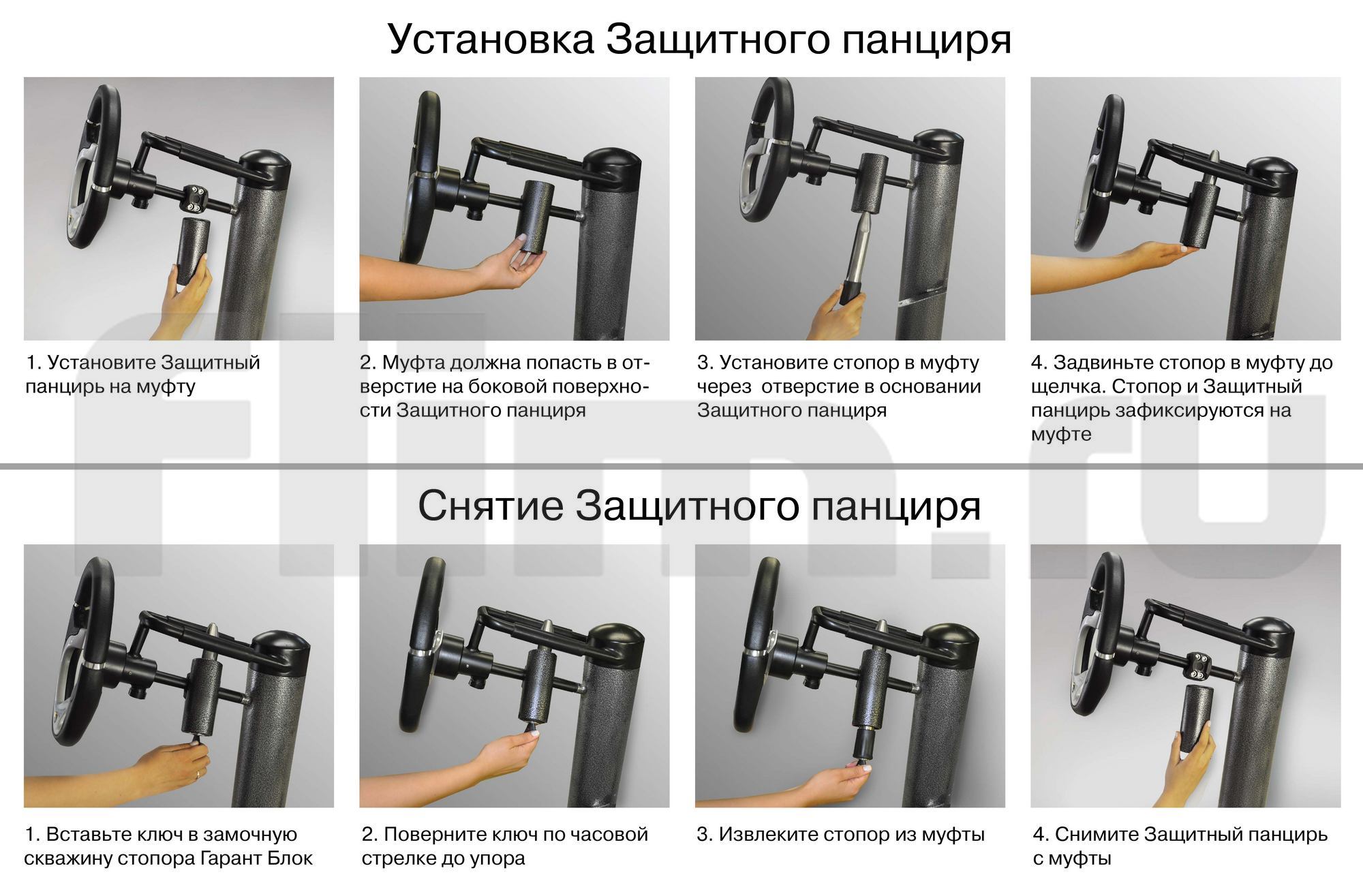 Для установки «Защитного панциря» на Гарант Блок нужно при снятом стопоре сначала установить «Защитный панцирь» сверху на муфту, а затем, через отверстие «Защитного панциря», установить стопор в муфту. После этого «Защитный панцирь» будет закреплен на муфте.
